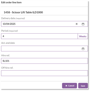 Click the edit button for an item to update the item details including delivery dates, period, actual end dates and on-hire/off-hire references.
