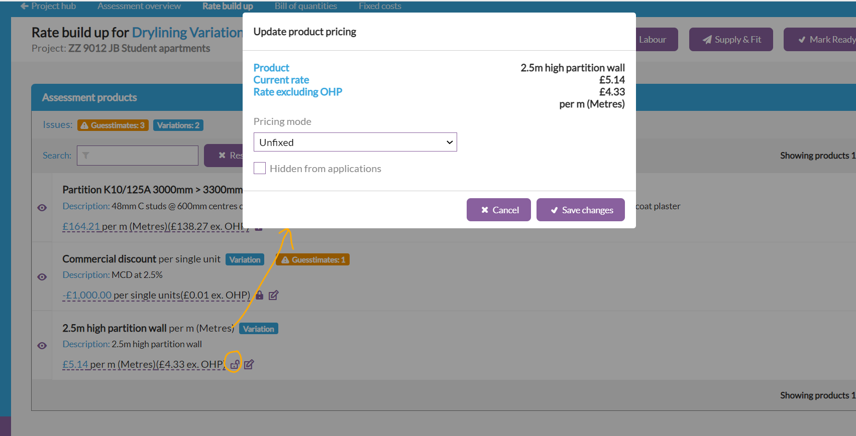 1. Add a product to your on-site assessment > Rate build up screen using the 'Add product' button in the bottom left corner. This will be flagged as a variation and will be added to the bottom of your rate build up.