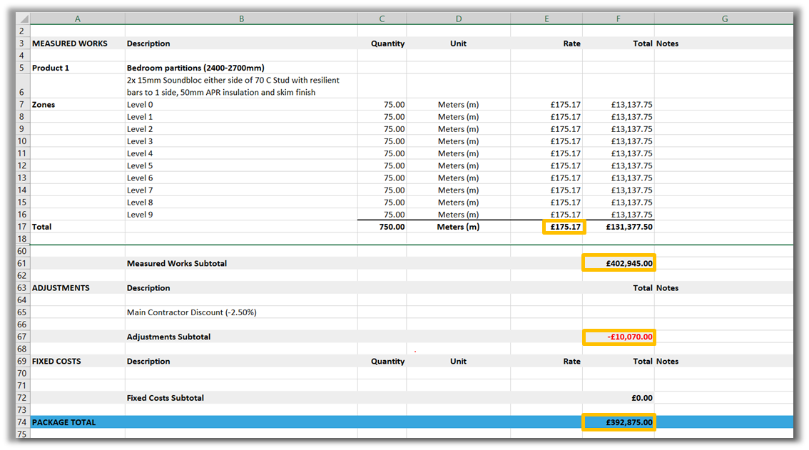For example, in the tender where a 2.5% MCD was identified at the bottom of the tender, the quoted rate was £175.17 so that when the discount applied to the project total, it established the ‘Adjusted price’ of £170.79.