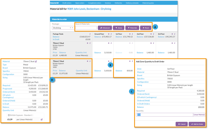For example, if you add 1500m2 of 15mm sound bloc board to an order and the current outstanding balance for this material is 500m2 in zone one, 700m2 in zone two and 1000m2 in zone 3. 500m2 will be added from zone one, 700m2 from zone two and 300m2 from zone 3, leaving a balance remaining in zone 3 of 700m2.