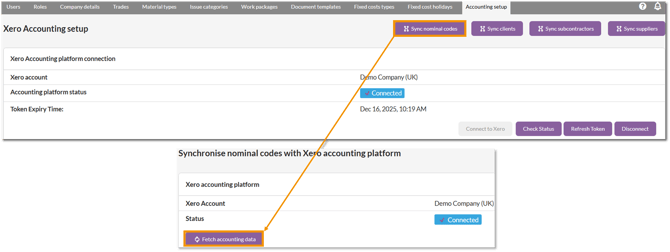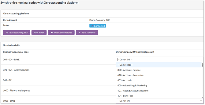 2. Click Fetch accounting data to load the current list of Chalkstring nominal codes and Xero accounts.