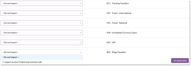 - For each Xero account in the bottom list, you have the option to Import it as a new Chalkstring nominal code (if it doesn’t exist in Chalkstring already) or leave it unimported.
