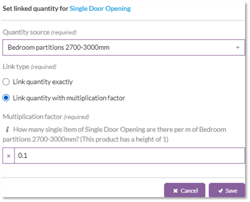 - Select the 'Quantity source' product from the dropdown menu and select whether you want to link the quantities exactly or use a multiplication factor.