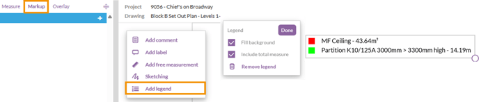 The legend will be included on both the drawing and measurements page in takeoff exports when the 'Markup' option is selected.